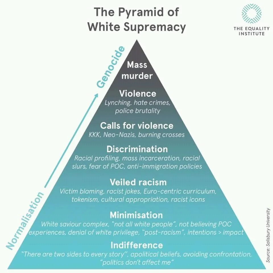 It's often intriguing to me that in my personal and professional lives I have talked about and shared information like this and graphics like this way more than I feel I should have to. The normalization and casual integration of racism, White supremacy, and White privilege affect me personally as a person of color but also professionally as an HR professional who works very hard to make sure hiring practices, management practices, and work cultures are devoid of this pyramid and its building blocks. You cannot imagine how many interactions with directors and hiring managers are rife with indifference and minimization or how integrated veiled racism is in the work culture and fabric of higher ed. It's daunting...but I've never been one to lay down. I'll keep sharing this info and educating and checking people and their supremacy personally and professionally because without challenge there is no change.